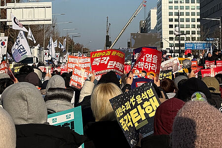 Ich habe an einer Kundgebung teilgenommen, bei der ein Amtsenthebungsverfahren gegen den südkoreanischen Präsidenten Yoon gefordert wurde. Er hatte plötzlich und ohne Verfahren das Kriegsrecht verhängt. Die Menschen waren schockiert, als sie sahen, wie die Soldaten wegen des Kriegsrechts die Nationalversammlung betraten.